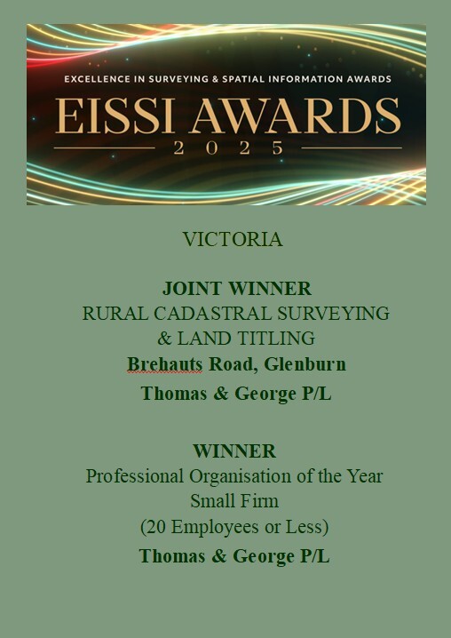 This award recognition from fellow peers within our industry, recognises the Thomas & George dedication and profesionalism provided to our Clients, the Cadastre, and our commitment to the training and development of the next generation of Surveyors both within and outside our company via our volunteering within Industry and commitment to Student Work Experience programs.